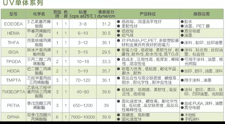 UV單(dān)體係列 EOEOEA .HEMA .THFA .ACMO .IOA .TM9EOPTA .PETIA .CTFA.TBCHA.DMAA